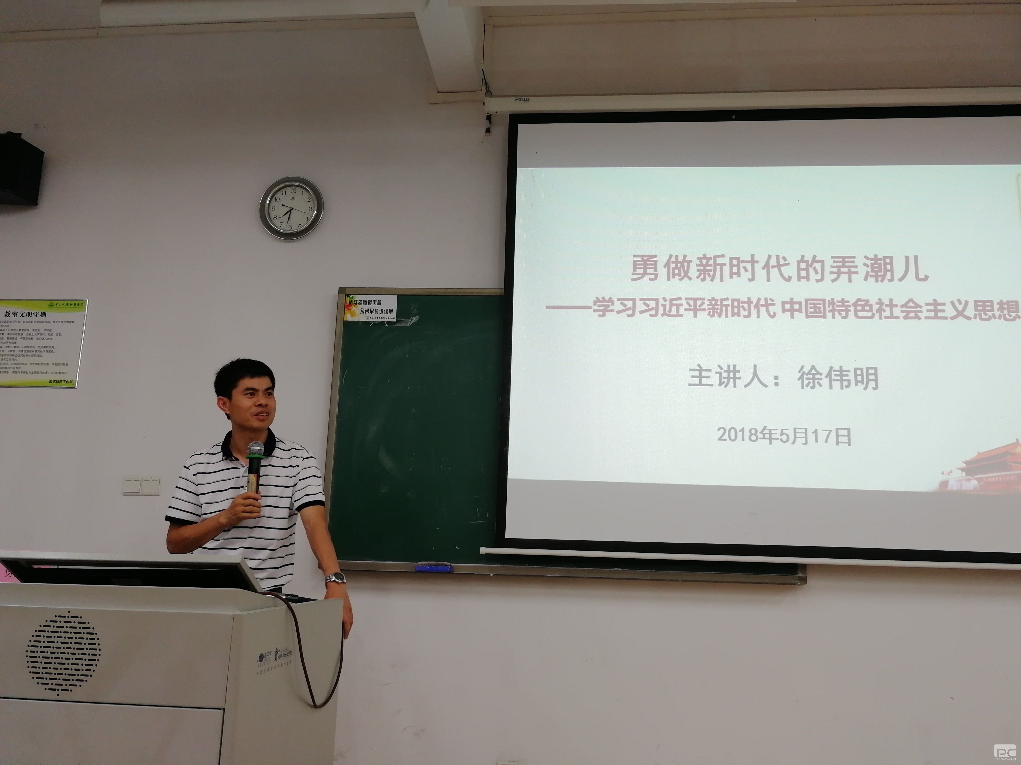 2018年5月17日晚7:30,中文系邀请太阳集团2007副主任徐伟明老师给中文系各年级班委团干开展了一场主题为“勇做新时代的弄潮儿”——学习习近平新时代中国特色社会主义思想的“青马工程”培训。出席现场的嘉宾有中文系学生办公室主任杨帮琰老师和中文系团委书记李靖老师。
