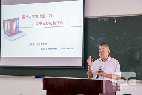 9月14日上午,中山大学新华学院校长、党委副书记王庭槐教授在广州校区为2017级听力与言语康复学专业的全体同学讲授题为“当代大学生理解、践行社会主义核心价值观”的“思政第一课”。王校长在课堂上系统梳理了社会主义核心价值观的发展历程和历史演变、社会主义核心价值观的具体内涵与外延,并为同学们重点讲解了三部分内容:第一,“什么是社会主义核心价值观”;第二,“为什么要倡导社会主义核心价值观”;第三,“当代大学生如何践行社会主义核心价值观”。并且勉励同学们:“在思想上要深入理解社会主义核心价值观的内涵,在行动上要踏踏实实践行社会主义核心价值观。”