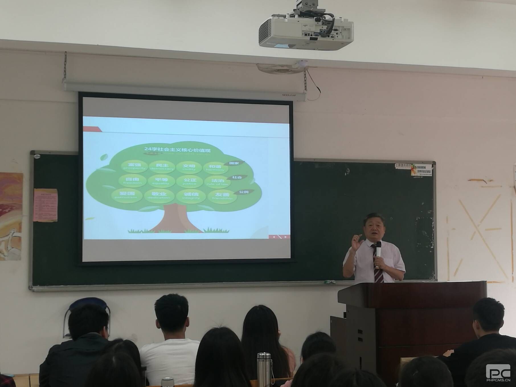 王庭槐校长首先为同学们讲述了社会主义核心价值观的基本内容,他告诉同学们,“富强、民主、文明、和谐、自由、平等、公正、法治、爱国、敬业、诚信、友善”这24个字凝聚了中华民族五千年的智慧和心血,对当代大学生的成长、成才有着重要的引领作用,是社会发展的标杆,希望大家牢记在心,内化于心,外化于行。