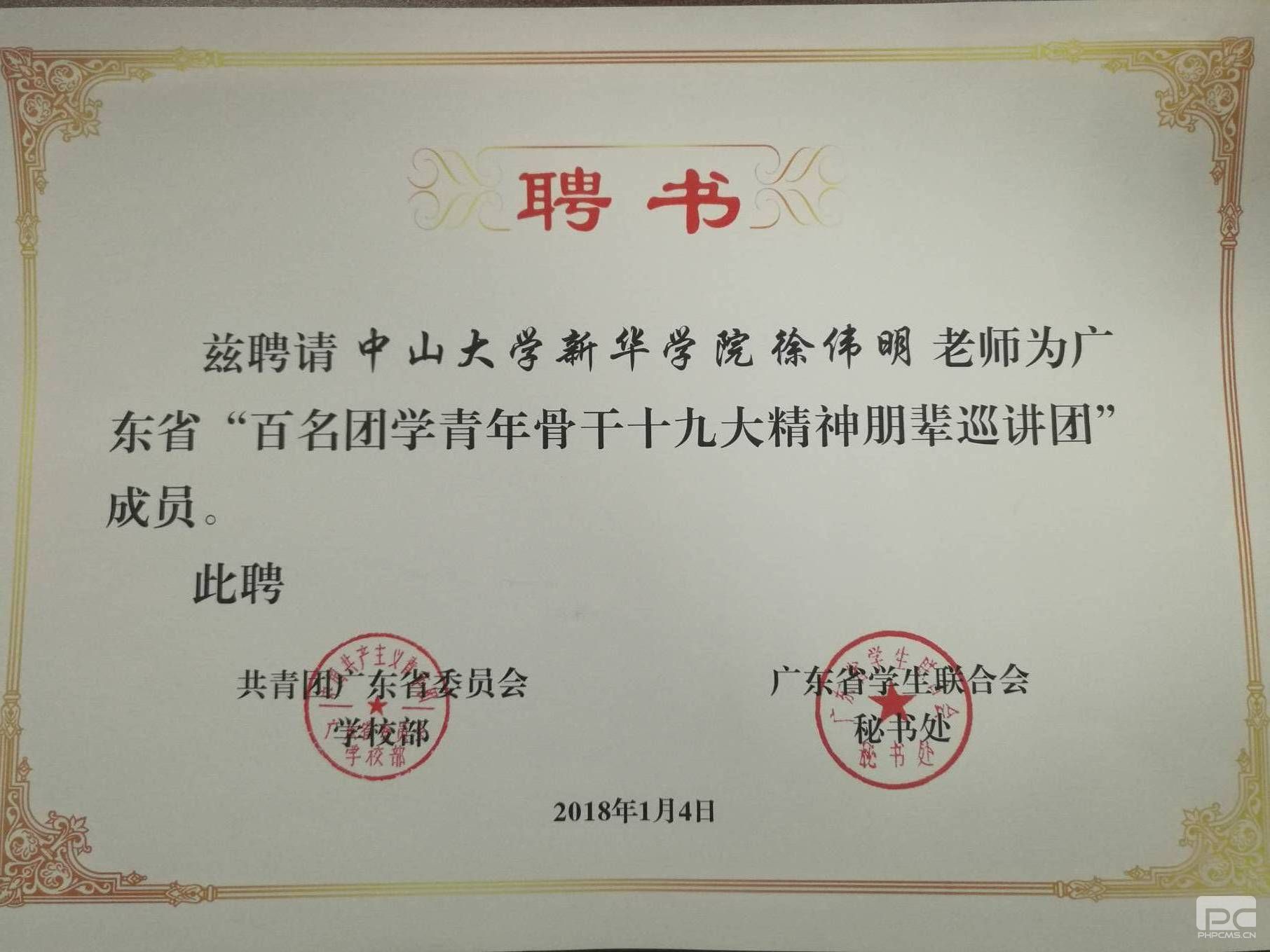 2018年1月4日,共青团广东省委学校部和广东省学生联合会秘书处公布了2018年“百名团学青年骨干十九大精神朋辈巡讲团”增选结果,马克思主义教研部徐伟明老师成功当选,另外,我校团委陈梓华、刘佳兴两人也一起当选为巡讲团成员,并授予聘书,巡讲团成员随后会走进高校走进大学生开展巡讲。
