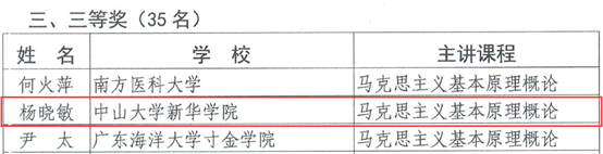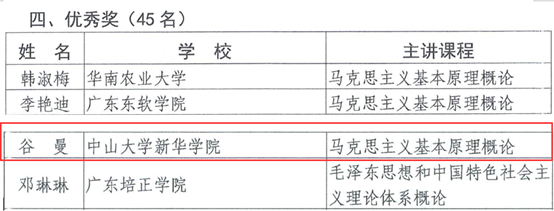 2018年7月至9月,广东省教育厅举办了2018年度省高校思想政治理论课青年教师教学基本功比赛,其目的是加强高校思想政治理论课青年教师队伍建设,提升思想政治课教育教学质量。比赛分初赛(学校评审)、视频复赛(录像评审)和现场复赛(现场讲课和答辩),以及决赛(现场讲课和答辩形式)三个阶段。近日,广东省教育厅粤教思函(2018〕94号文公布了“2018年度广东省高校思想政治理论课青年教师教学基本功比赛”结果,其中我部杨晓敏老师获得三等奖,谷曼老师获得优秀奖。