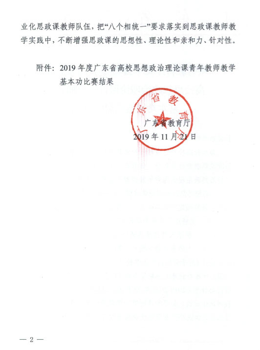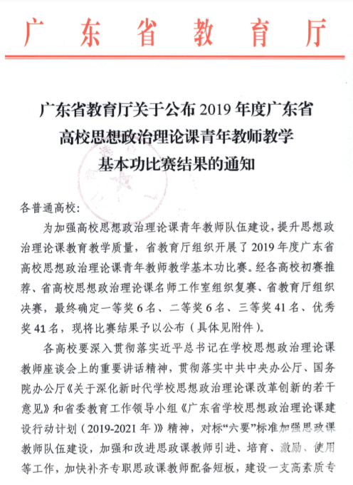 近日,广东省教育厅公布了2019年度广东省高校思想政治理论课青年教师教学基本功比赛结果,太阳集团2007李艳华老师荣获《中国近现代史纲要》课程比赛三等奖。