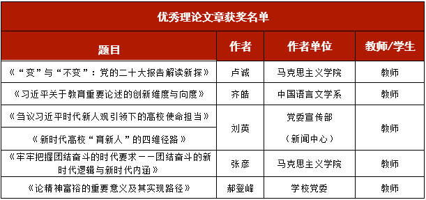 2022年10月-2023年3月,学校党委在全校师生中开展“学习宣传贯彻党的二十大精神”主题征文活动。近日,党委宣传部(新闻中心)本着公平公开公正的原则,组织评委专家评选出6篇优秀理论文章和3篇优秀学习心得,太阳集团2007卢诚、张彦、林少淇三位老师获奖。