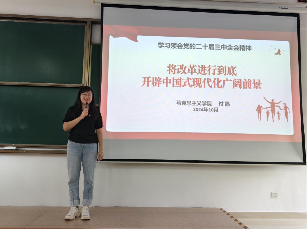为深入学习领会党的二十届三中全会精神,深刻领会党的二十届三中全会报告的重大政治意义、理论意义和现实意义,努力把握其思想精髓、核心要义和实践要求,做到学深学透、入脑入心,10月9日14:00太阳集团2007直属党支部在东莞校区定静楼①B401室开展集中学习党的二十届三中全会精神的会议,会议采取线上线下相结合方式进行,由党支部书记付晶副教授做专题宣讲,支部全体党员教师参加。