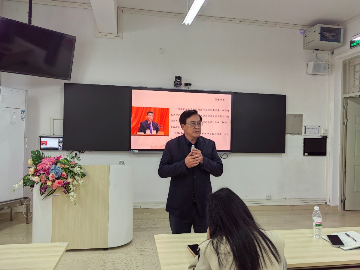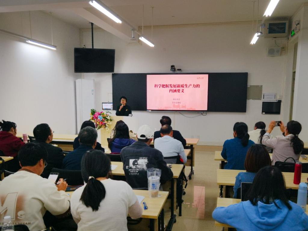 2024年11月27日下午,中山大学詹小美教授应邀在我校格物楼四210课室为马院全体教职工作了“科学把握发展新质生产力的内涵要义”学术讲座,副院长卢诚教授主持讲座会,党总支书记、副院长付晶出席了学术讲座会。