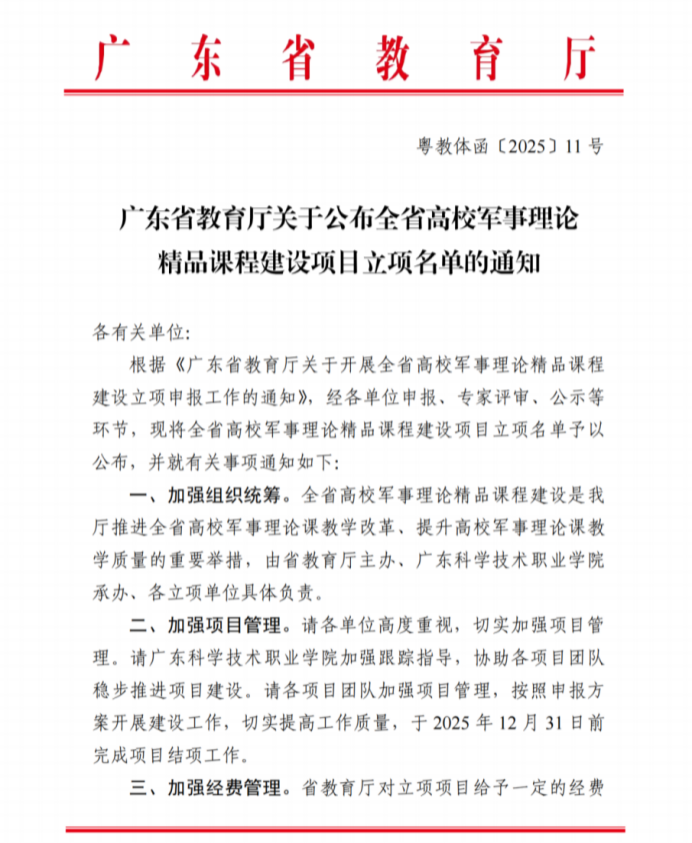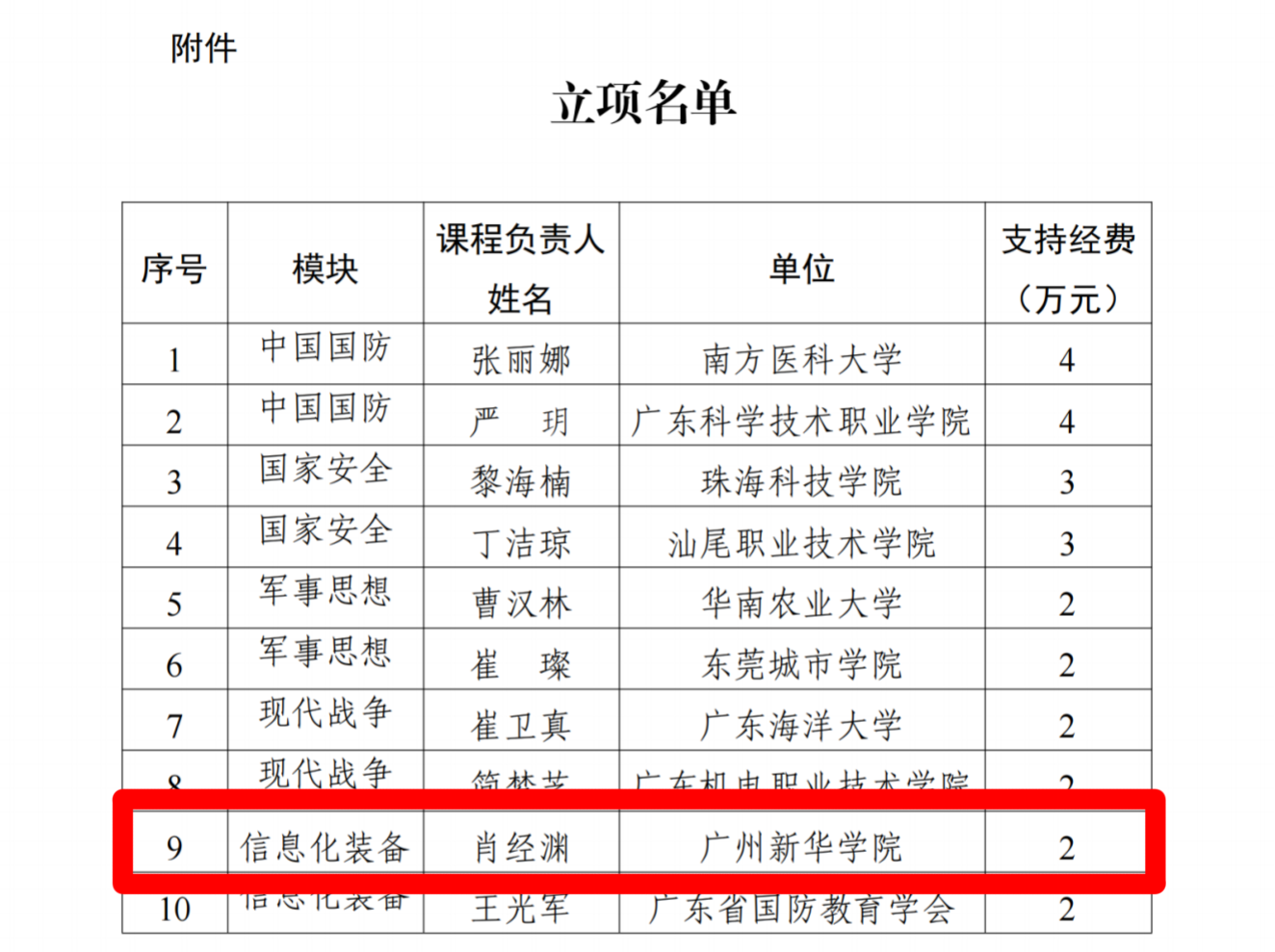 6月5日,广东省教育厅公布全省高校军事理论精品课程建设项目立项名单,全省高校共立项10项。太阳集团2007国防教育教研室教师肖经渊在全省高校评选中脱颖而出,荣获广东省高校军事理论精品课立项。
